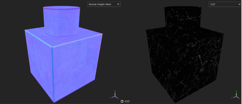 塗りつぶしレイヤーのHeightパラメータを調整して傷の深さを変えたり、マスクテクスチャのタイリング等パラメータを調整して傷を作成しましょう。