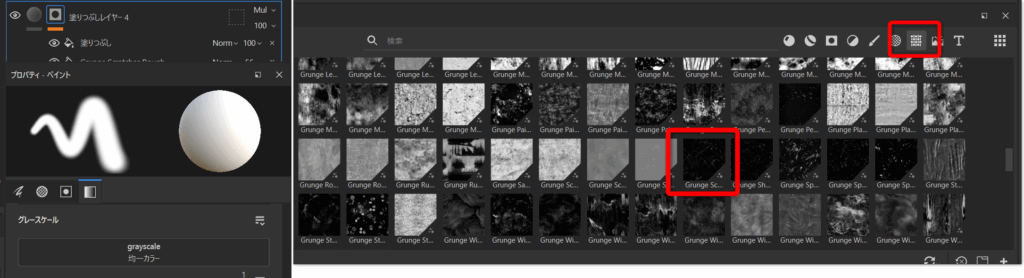 塗りつぶしのプロパティのgrayscaleに対してアセットのテクスチャから”Grunge Scratches Rough”を選びます。