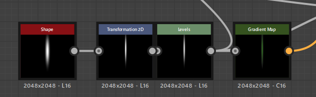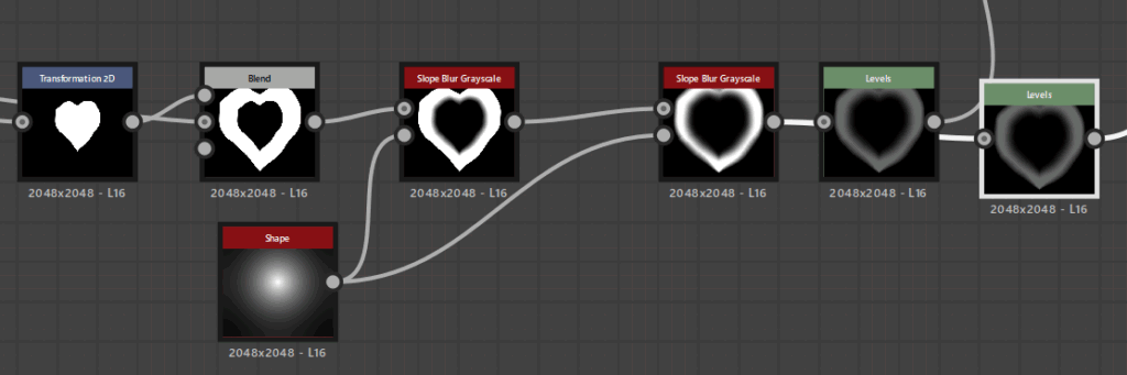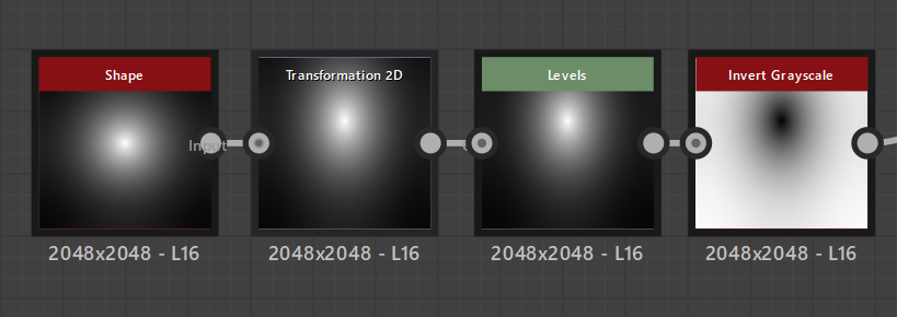 Transform2Dで少し形を伸ばします。Levelsで明るさを調整、Invert Grayscaleで反転させてBlendノードにつなげます。Mode:Multiply Opacity:0.87
