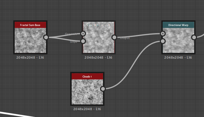 ノイズを入れていきましょう。Fractal Sum BaseにSlope Blur Grayscaleを繋げます。 Directional Warp にClouds1とSlope Blur Grayscaleを画像を参考につなげます。