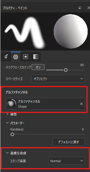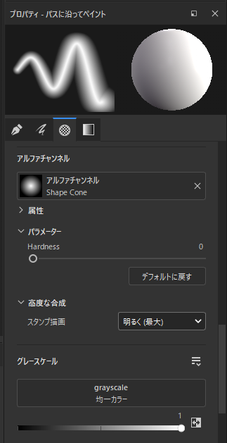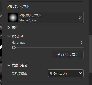 高度な合成のスタンプ描画を”明るく(最大)”に変更します。