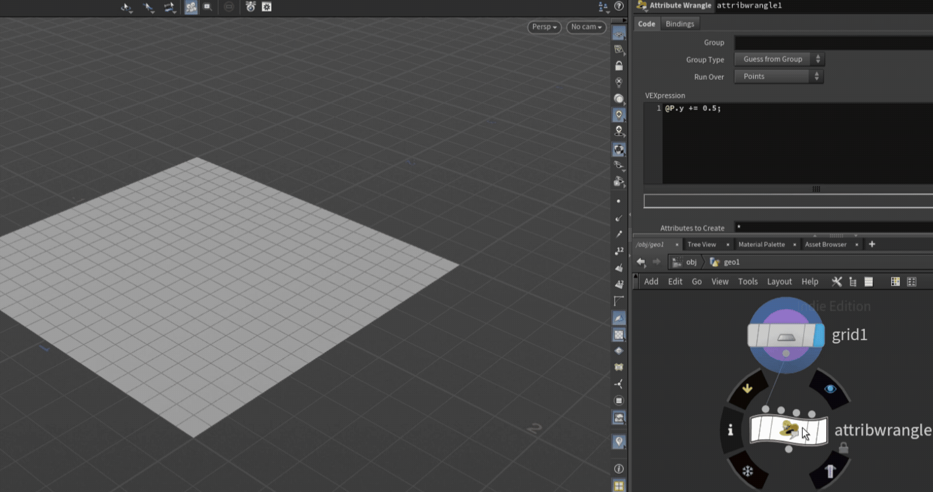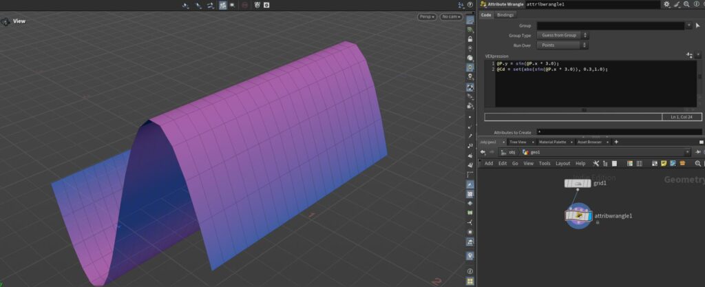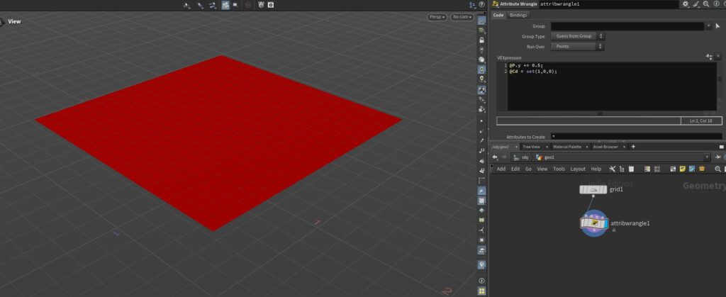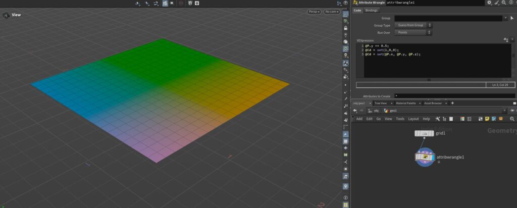 Attribute Wrangleを使って位置(@P)と色(@Cd)を調整します。