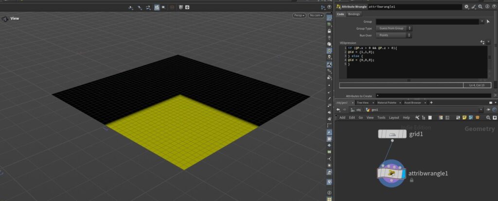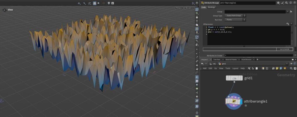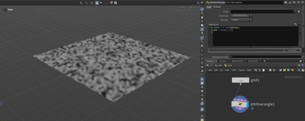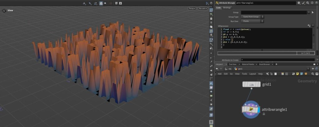 Attribute Wrangleを使って、形状や色を部分的に変えたりランダムに変化させたりしてみたいと思います。