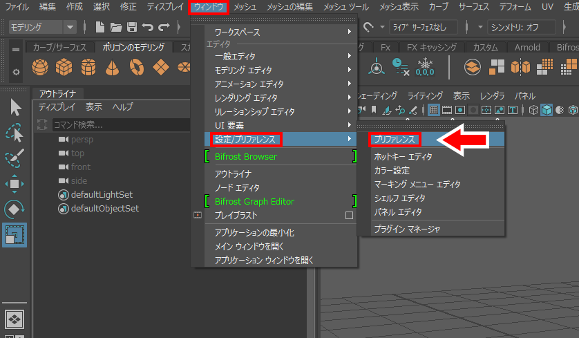 Mayaを開き、ウィンドウ>設定/プリファレンス>プリファレンスを選択します。