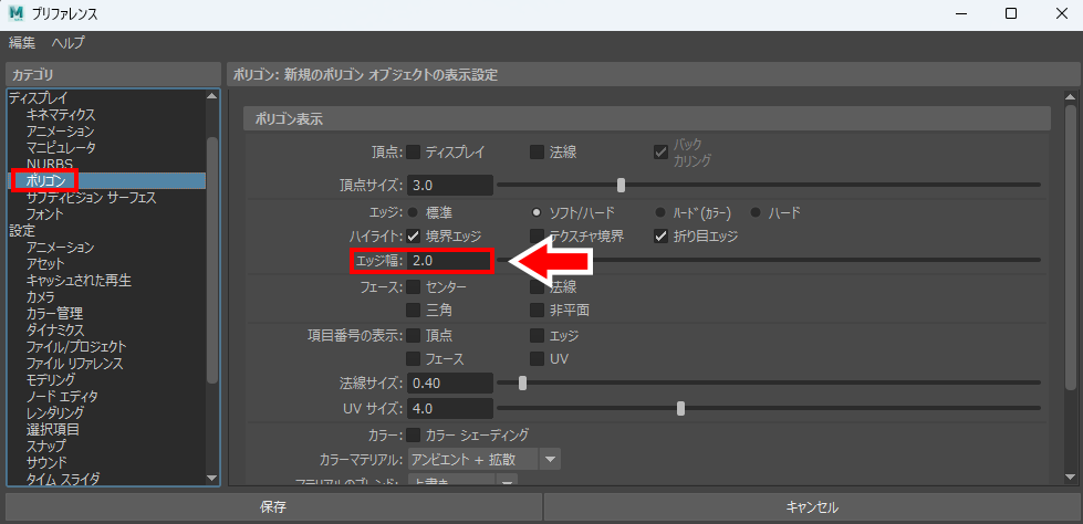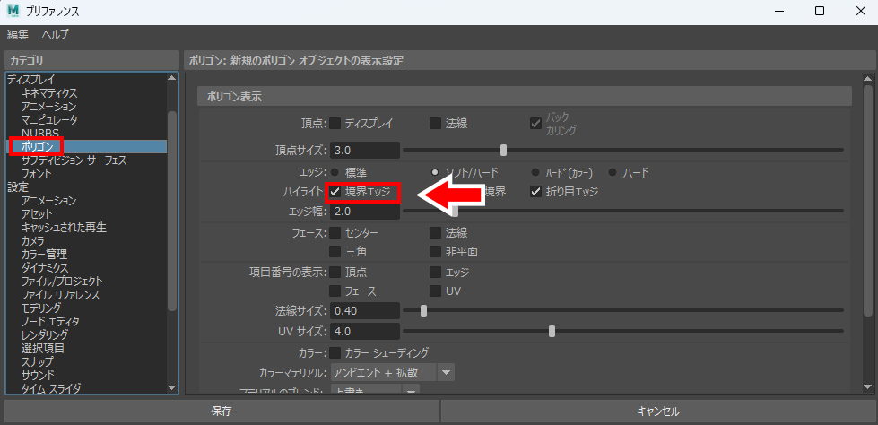 プリファレンス画面が出てくるので、左のカテゴリからポリゴンを選択します。ポリゴン表示の設定から境界エッジを選択して保存します。