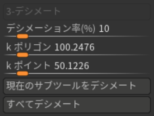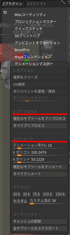 プリプロセスを選択した後に、デシメート内のデシメーション率に数値をを入れます。 現在のサブツールをデシメートまたは、すべてデシメートのどちらかを選び押すとポリゴンを減らすことができます。
