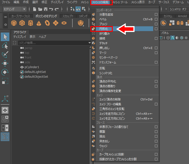 メッシュを編集>円形化を選択します。