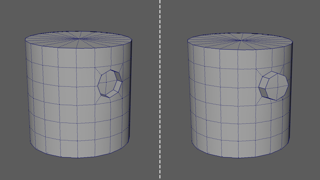 頂点やエッジの処理が少なくなります。また、曲面など穴を開けづらい部分にも簡単に開けることができます。