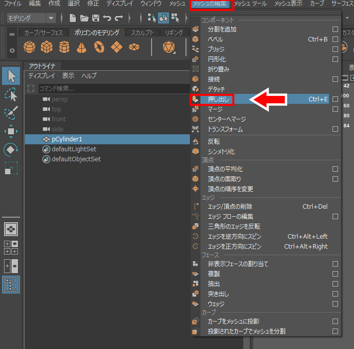 穴を開けたい部分をメッシュの編集>押し出しをします。