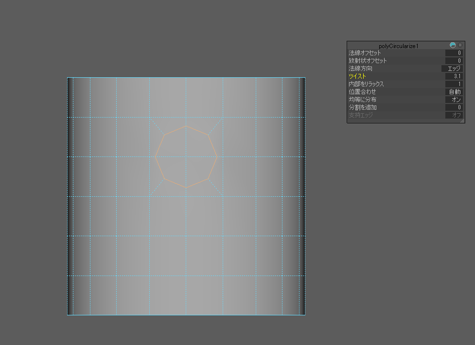 円形になりました。周囲のエッジが歪んでいる場合はツイストの数値を調整します。