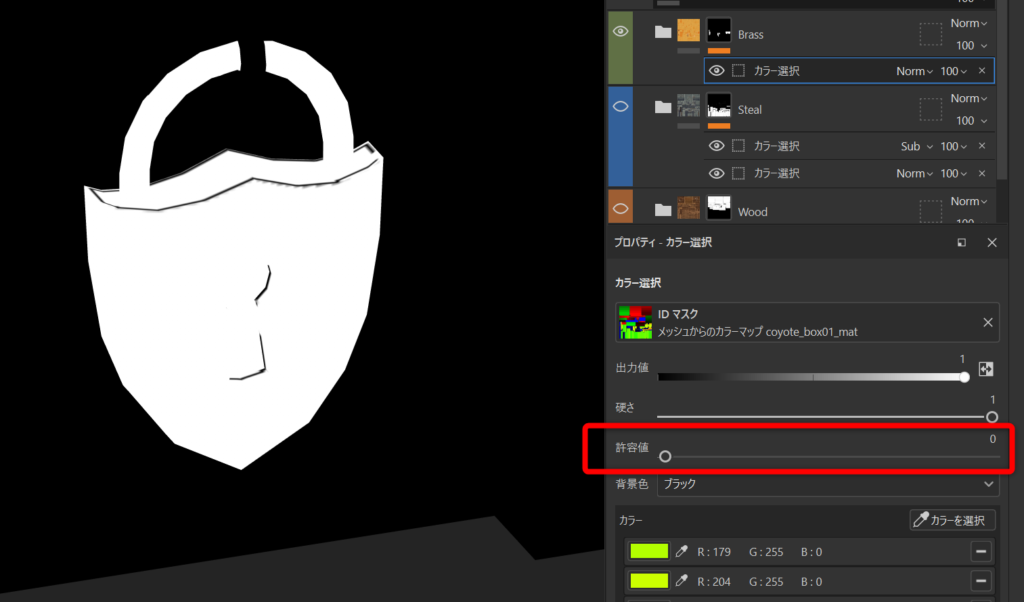 カラー選択のプロパティを開きます。操作するパラメータは『許容値』です。
