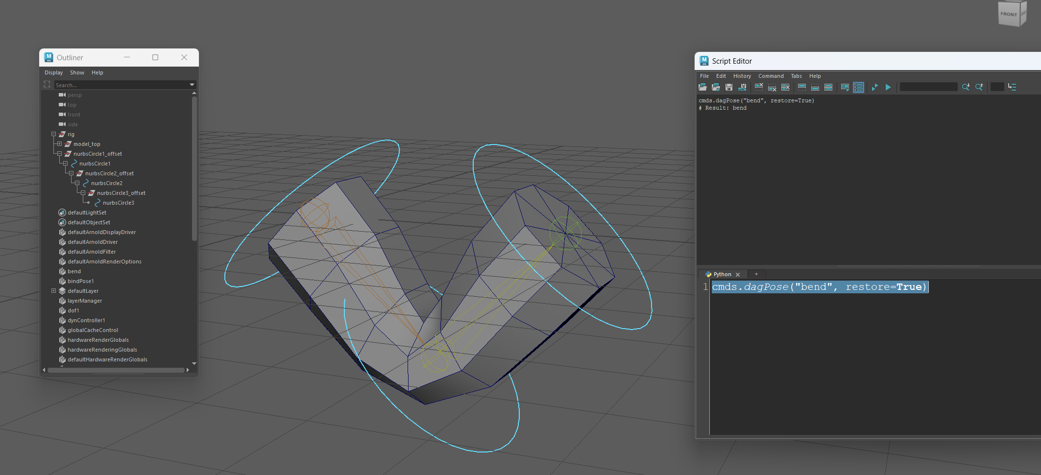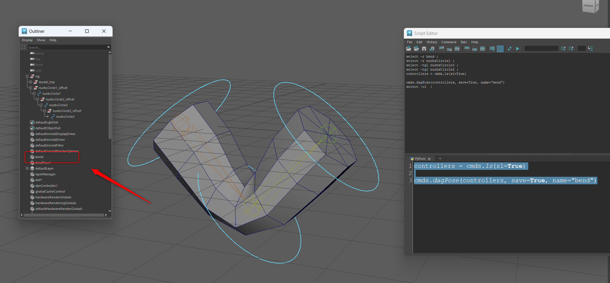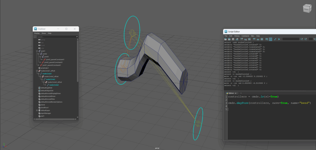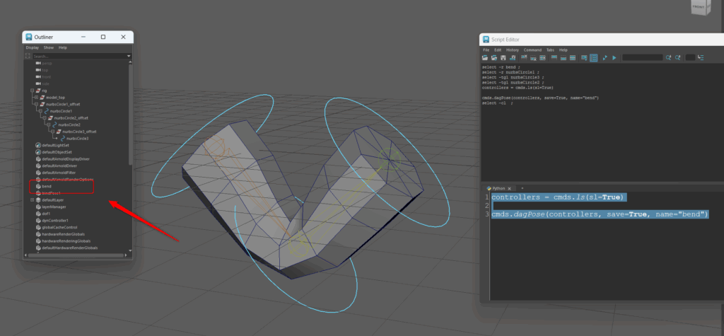 このポーズをdagPoseノードで保存します。コントローラーを選択した状態で以下のスクリプトを実行すると bend と名付けたdagPoseノードが作成されています。